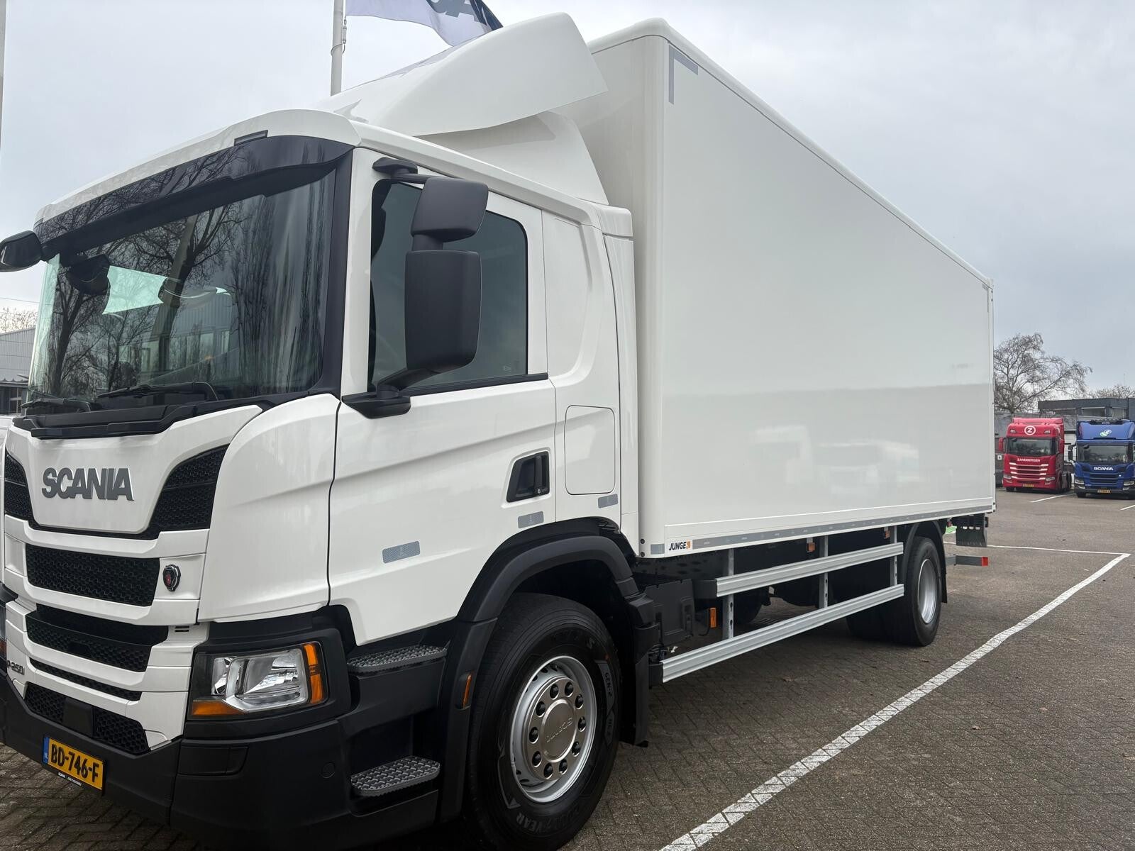hier bij een foto van binnen en van buiten van een nieuw Scania van de dealer
